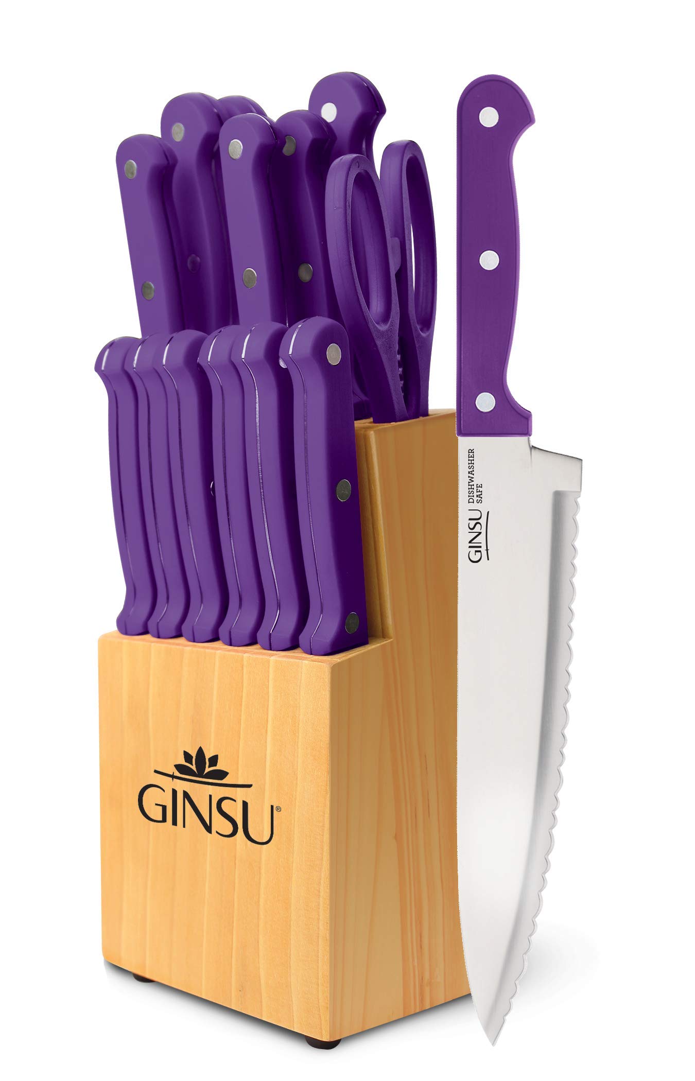 Say hello to Ginsu Kiso series! The Purple 14 piece Kiso knives are the perfect sharp, high-quality, uncomplicated set of tools for any kitchen. Kiso is easy to own with blades that are polished to a mirror finish making them dishwasher safe! Kiso is easy to use. Their exclusive Ginsu serration make chopping, slicing, and dicing effortless! This 14 piece set includes; 8” chef, 8: slicer, 7” Santoku, 5” Boning, 4. 5” utility, 4. 5” steak (6), 3. 5” Paring, premium shears and a natural wood block.